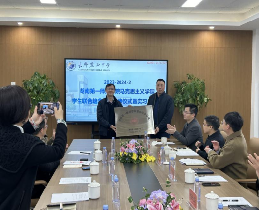 王竹苗副经理和宋徽瑾、吴承富老师以及20思政1班11名实习生参加会议,长郡麓谷中学李望雄董事长、张波男副董事长、伍先华副董事长、全体行政干部、年级组长、实习指导老师参加会议。