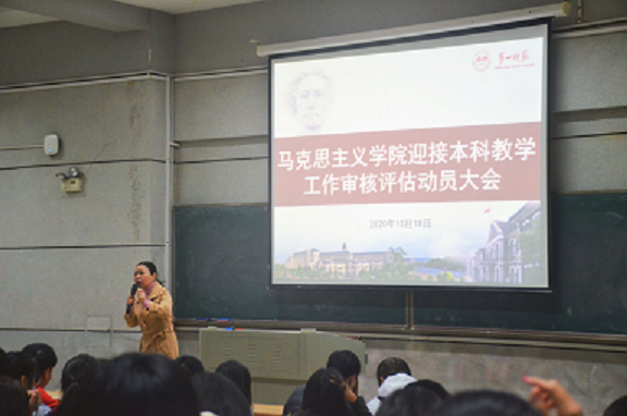 10月18日晚,w66旗舰厅在润寰楼南201教室召开本科教学工作审核评估员工动员会。党总支书记欧阳斐、副书记谢素科、学工办主任付淑敏,各班班主任以及全体在校员工参加会议。会议由付淑敏主持。
