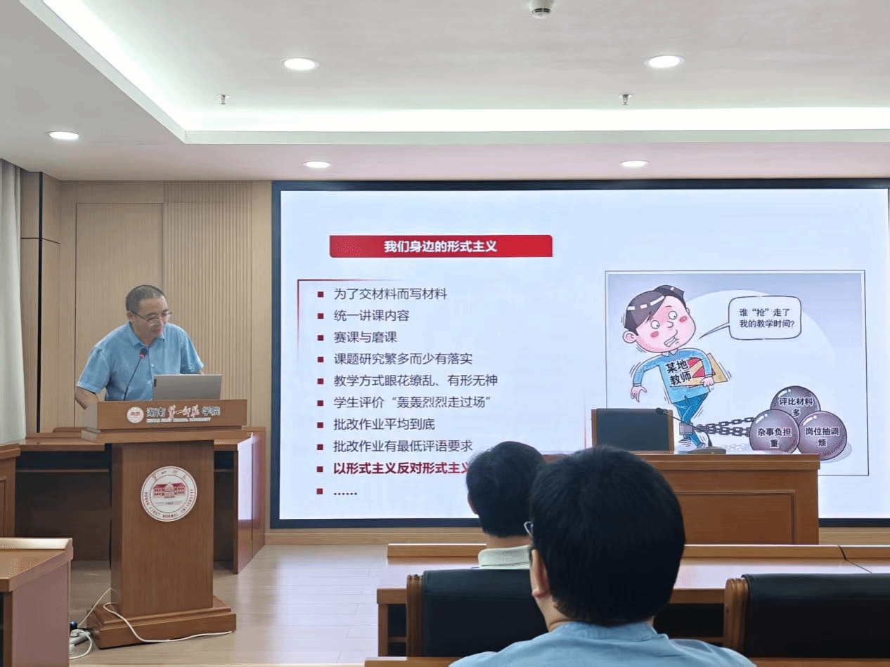 党支部书记吴承富以《坚决反对形式主义》为题,直击痛点,发人深省。他结合基层工作实际,列举了工作中可能存在的过度留痕、重复报表、会议冗长等形式主义表现及其对教师精力、教学创新的严重消耗。吴承富强调,反对形式主义绝非空喊口号,必须拿出刮骨疗毒的勇气和务实管用的举措。他要求支部全体党员从自身做起,从每一次会议、每一份材料抓起,大力倡导“短实新”的文风会风,坚决破除束缚教师手脚、影响育人实效的形式主义枷锁,让教师能将宝贵精力真正回归课堂、回归员工。