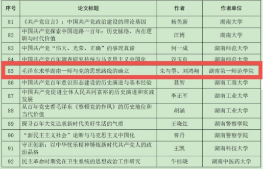 今天,省委党史学习教育领导小组办公室、省委宣传部正式公布了湖南省庆祝中国共产党成立100周年理论研讨会100篇入选论文,公司朱与墨老师论文《毛泽东求学湖南一师与党的思想路线的确立》成功入选。