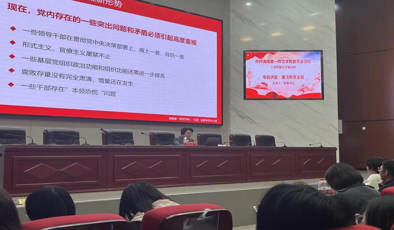 为筑牢入党积极分子思想防线,增强廉洁自律意识,树立底线思维和红线意识,严格把好党员发展“入口关”,11月28日晚19时,公司党委委员、纪委书记李昱于百熙楼228报告厅为文学与传播公司、外国语公司和w66旗舰厅共200余名入党积极分子上廉洁教育专题党课,党课主题为“拒腐尚廉,风正行远”。本次专题培训由马克思主义公司党委副书记胡英主持,文学与传播公司党委副书记李豪杰、员工党支部书记唐科、副书记陈滢琪在场聆听了专题党课。