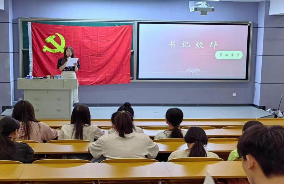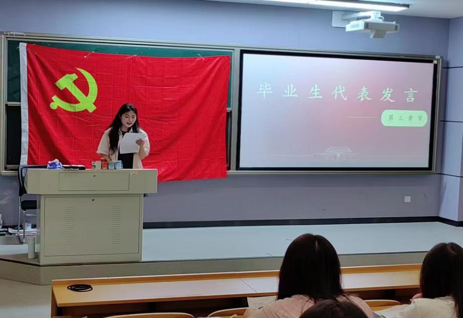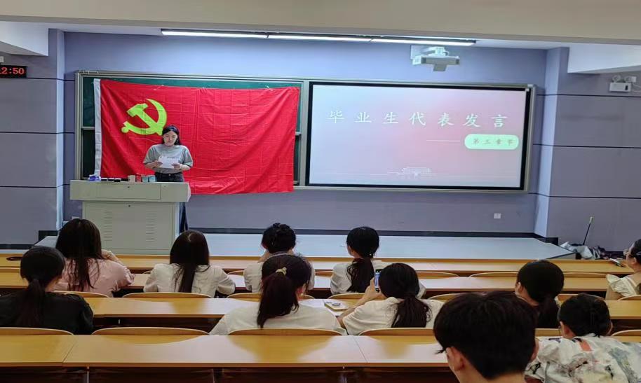 随后,毕业生党员代表龚佳颖、陈潇潇致辞发言,她们回顾大学四年的成长历程,以自身经历阐述了党的理论学习和个人使命担当的重要性,她们强调,作为青年党员,要牢记习近平总书记的殷殷嘱托,积极响应“大思政要抓好、红色资源要用好、第一师范要办好”的新要求,以青春之声传递信仰力量,以奋斗之姿绘就青春底色。