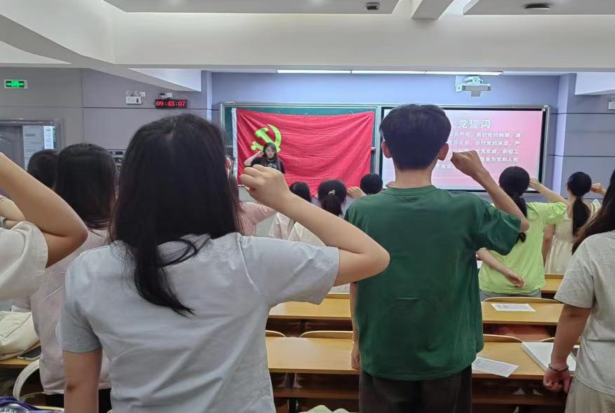 会议第二部分,徐雪情等12名预备党员依次上台,从理论学习、政治觉悟、思想认知、工作生活等方面向党组织汇报本人在预备考察期间的表现,充分表达了对党的坚定信仰和为党的事业奋斗终身的决心。经全体正式党员无记名投票表决,大会一致同意12名预备党员按期转为正式党员。在党支部书记刘艳霓的带领下,新党员同志佩戴党徽面向党旗庄严宣誓。