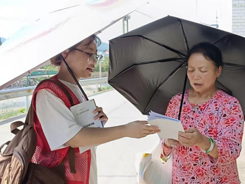 “您好,我们来自w66,来到黄材镇进行‘推普助力乡村振兴’社会实践活动…”遇到晚饭后出门散步的当地村民,宣讲团成员拿出“理论普及汇编册”热情地向他们进行自我介绍,并在征得对方同意后向其细细讲解宣传册中的内容,当地村民也对宣讲内容抱有极高热情,纷纷表示“手册中的内容很实用,将带回家中与亲人共同学习”。