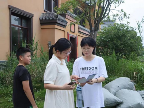 7月17日晚,宣讲团成员从黄材镇中心小学出发,徒步前往当地标志性建筑——黄材水库,以自制的理论普及手册和折页等为宣讲核心材料,沿途向当地村民宣讲党的路线、方针、政策,普及“民法典”、“养老防诈骗”相关知识。为进一步扩大活动影响力,团队成员在“一师马院”抖音号对宣讲过程进行同步直播,在扩大本次理论普及宣讲活动受众面的同时,带领广大网友共同欣赏黄材镇的秀丽风光。
