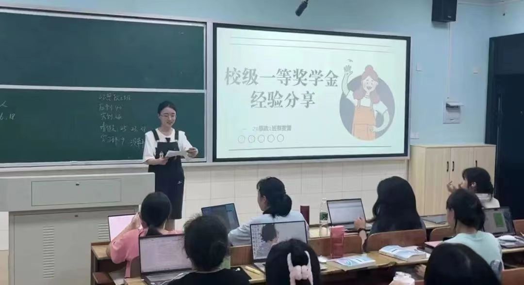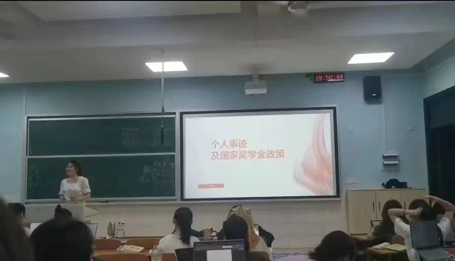 国家奖学金获得者——2020级825思政班陈潇潇分别从思想、学习、工作、志愿以及实践五个角度对个人成长故事进行了分享,激励同学们求真学问、练真本领,用勤奋书写出彩青春,不辜负国家的好政策,不辜负党和国家的殷切期望。随后,陈潇潇对国家奖学金政策做了详细介绍。