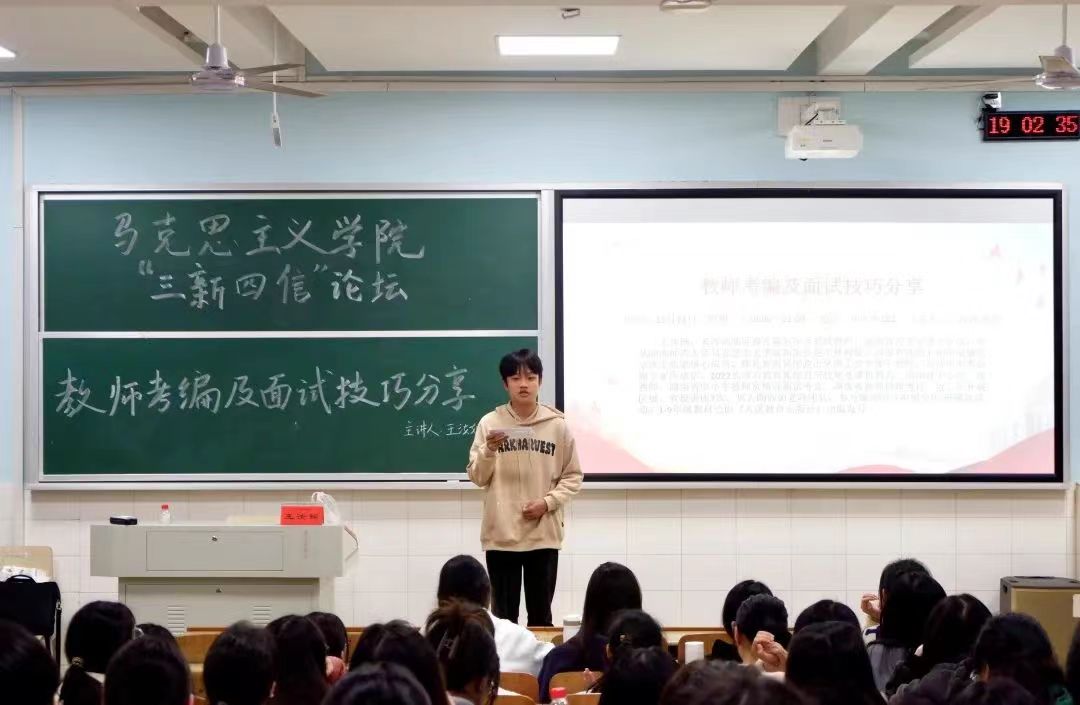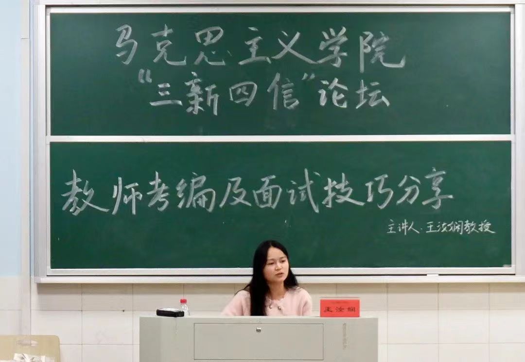 11月22日晚,公司在怀中南102教室顺利举行了“三新四信”论坛讲座。此次讲座以“凝心铸魂育新人 筑梦前行赴新篇”为主题,由王汝娴老师主讲,主要分享教师考编及面试等各方面经验。公司21级、22级思想政治教育专业员工在场聆听了此次讲座。