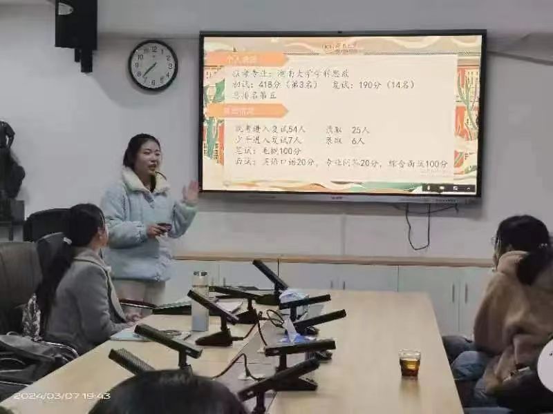 会议伊始,刘艳霓介绍了与会的2023届考研员工代表,并对她们的到来表示热烈欢迎。会上,就读于华中师范大学的夏晶晶同学从不同维度对复试准备进行了经验分享,指出要根据复试公告获取复试要求,还要关注社会热点,及时了解报考院校导师研究方向。就读于湖南大学的邓思同学从复试准备、复试模拟、复试实践以及思政前沿四个方面进行了详细解读,她强调,一定要根据复试大纲规划备考时间和重点,牢牢掌握思政相关前沿热点知识,通过复试模拟不断提高应试能力。随后,谭唯、屈佳雨和朱继顺等三位同学则结合今年的考研形势和个人体会,分别从复试前准备、笔试、面试、调剂和心态调整等几个方面为在座的同学们提出了宝贵建议。
