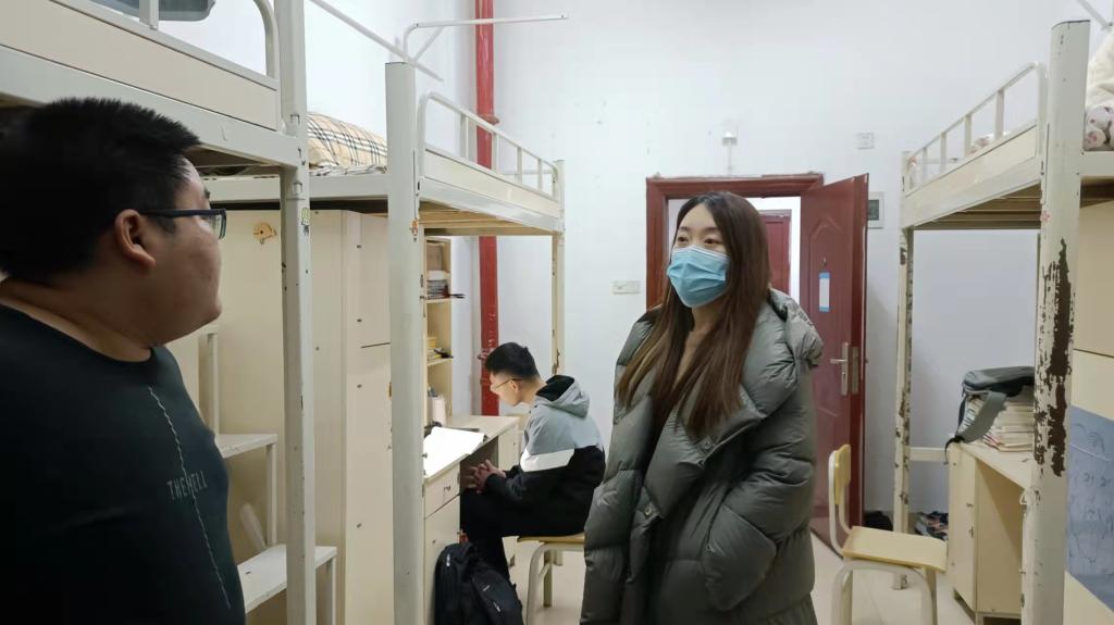 3月21日晚,w66旗舰厅辅导员刘艳霓走访了女生寝室11栋和男生寝室15、16栋,检查寝室卫生情况,了解员工学习生活情况,督促同学们认真备考四六级,同时了解同学们的心理状况,及时疏导。最后要求同学们严格遵守公司疫情防控政策要求,寝室每天通风,保持整洁,并且要及时做好消杀工作。