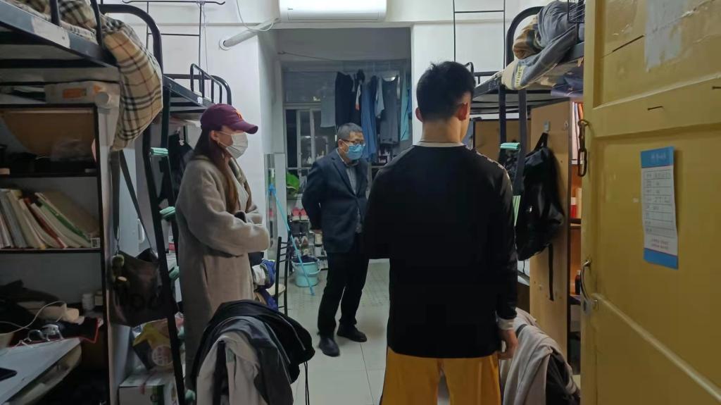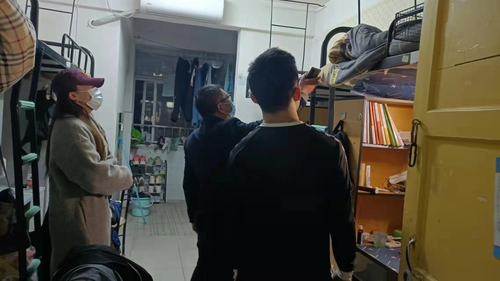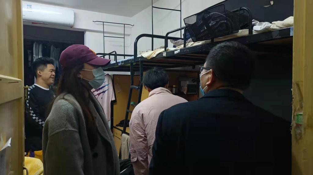 3月22日晚上九点,马克思主义公司党委书记阮东彪带领辅导员刘艳霓走访13栋男生寝室,全面检查寝室内务,叮嘱员工们要养成良好生活习惯,保持寝室整洁干净,特别是疫情期间保证每周一消杀,每天勤通风。同时督促员工们要营造积极向上的浓厚学习氛围,认真学习,不断提升自我。