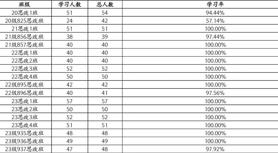 在本次青年大学习中,21级857思政班、22思政1班、22思政2班、22思政3班、22思政4班、22级895思政班、23思政1班、23思政2班、23思政3班、23思政4班、23级935思政班、23级936思政班学习率达到了100%,在这里提出表扬;
