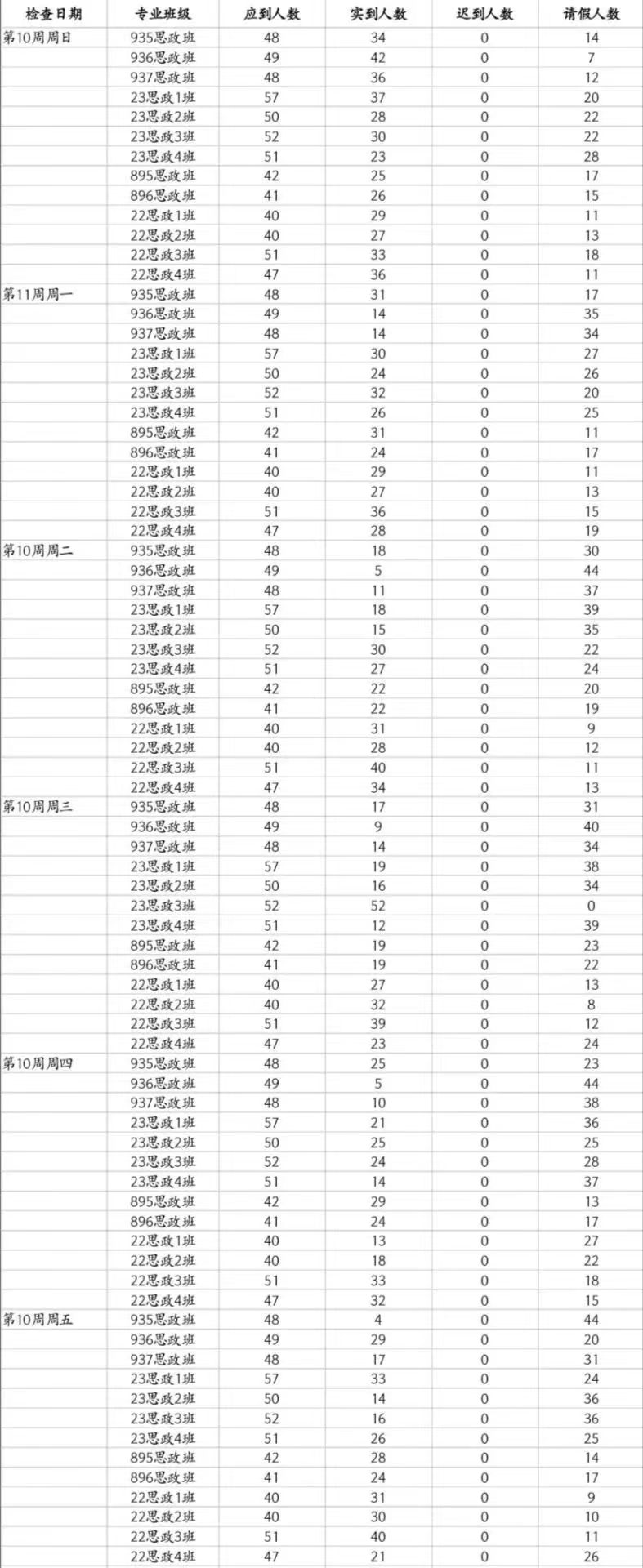 本周大部分班级表现良好,但有班级出现缺席现象,如22思政4班7号刘婉婷和48号刘耕彤两位同学,希望表现好的班级继续保持。