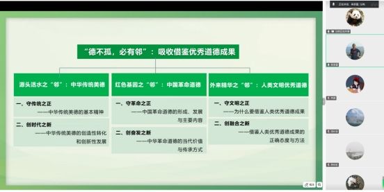 汪俐分享了教材第五章第二节《吸收借鉴优秀道德成果》汪俐从“德不孤、必有邻”的题目入手,介绍了中国特色社会主义道德建设需要吸收借鉴源头活水之“邻”,红色基因之“邻”,外来精华之“邻”。重点展示实践中需要守传统之正,创时代之新;守革命之正,创奋发之新;守文明之正,创融合之新。