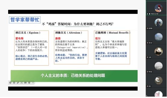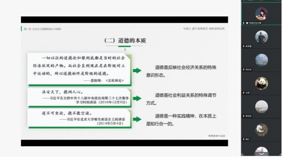 肖彦分享了教材第章第节《社会主义道德的核心与原则》。肖彦从道德的概念和起源开始分析,揭露了天意神启论、先天人性论、情感欲望论等关于道德起源的局限和错误,进而深入分析了马克思关于道德的起源理论,认为劳动是道德起源的首要前提、社会关系是道德赖以产生的客观条件、人的自我意识是道德产生的主观条件之后分析了社会主义道德的先进性,社会主义道德坚持以为人民服务为核心和坚持以集体主义为原则。