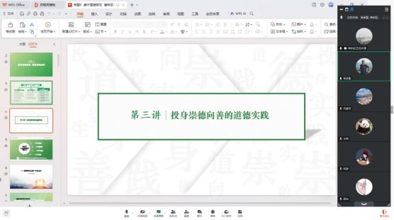 李彩虹分享了教材第五章第节《投身崇德向善的道德实践》。李彩虹认为,老员工应当做社会主义道德的实践者、示范者和引领者。需要从遵守社会公德、恪守职业道德、弘扬家庭美德、锤炼个人品德四个方面入手在遵守社会公德部分,通过道德两难选择的案例和理论,提高了授课的高阶性,通过网络道德的热点问题,增强了员工的参与性。在恪守职业道德部分,重点讲述了人劳动精神、劳模精神和工匠精神。在弘扬家庭美德部分,结合近代湖南著名人物的家风和家教历史案例,突出了家风家教的主要内涵和意义。在锤炼个人品德部分,重点介绍了古代关于道德修养的五种方法,并提出老员工要通过投身崇德向善的道德实践,不断引领社会风尚,提升道德境界。